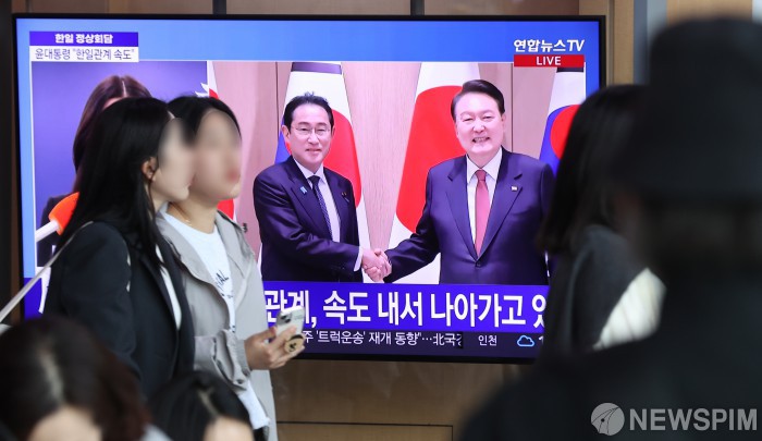 [서울=뉴스핌] 김학선 기자 = 윤석열 대통령과 기시다 후미오 일본 총리의 한일정상회담이 열린 7일 오후 서울역 대합실에서 시민들이 정상회담 관련 뉴스를 시청하고 있다. 2023.05.07 yooksa@newspim.com