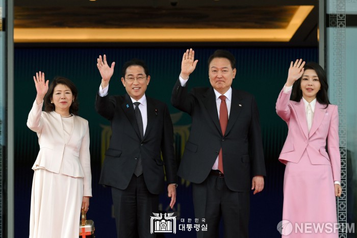 [서울=뉴스핌] 윤석열 대통령과 부인 김건희 여사, 기시다 후미오 일본 총리와 부인 유코 여사가 7일 서울 용산 대통령실 청사 앞에서 손 흔들어 인사하고 있다.[사진=대통령실] 2023.05.07 photo@newspim.com