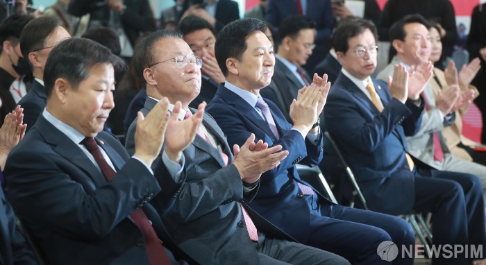 [서울=뉴스핌] 이형석 기자 = 김기현 국민의힘 대표(왼쪽 세번째)가 8일 오전 서울 여의도 국회에서 열린 윤석열 정부 출범 1주년 사진전 개막식에서 박수를 치고 있다. 2023.05.08 leehs@newspim.com