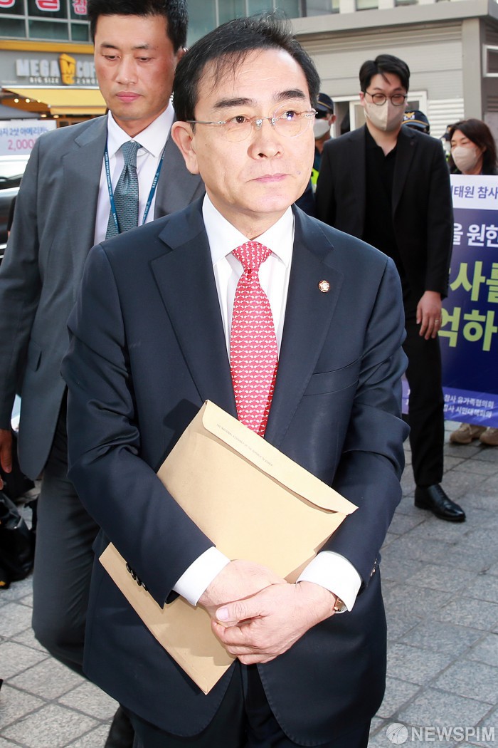 [서울=뉴스핌] 이형석 기자 = 태영호 국민의힘 최고위원이 8일 오후 서울 여의도 국민의힘 중앙당사에서 열린 중앙윤리위원회에 출석하고 있다. 2023.05.08 leehs@newspim.com