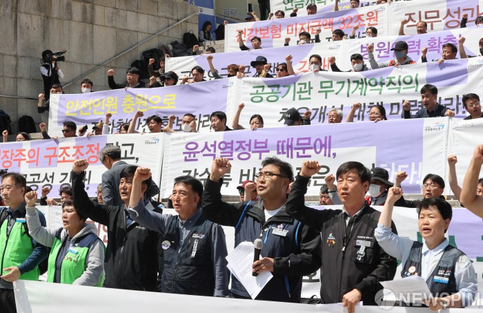[서울=뉴스핌] 김학선 기자 = 공공운수노조가 9일 서울 광화문 세종문화회관 앞에서 '윤석열 정부 1년 공공-운수-사회서비스 노동자 대표자 선언' 기자회견을 열고 있다. 2023.05.09 yooksa@newspim.com