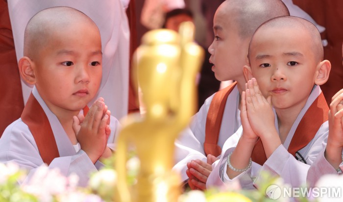 [서울=뉴스핌] 김학선 기자 = 불기 2567년 부처님오신날을 앞두고 11일 서울 종로구 조계사에서 열린 관불의식 입재식에서 삭발 수계식을 한 동자승들이 합장하고 있다. 2023.05.11 yooksa@newspim.com