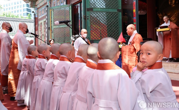 [서울=뉴스핌] 김학선 기자 = 불기 2567년 부처님오신날을 앞두고 11일 서울 종로구 조계사에서 삭발 수계식을 한 동자승들이 아기 부처를 목욕시키는 관불의식을 하고 있다. 2023.05.11 yooksa@newspim.com