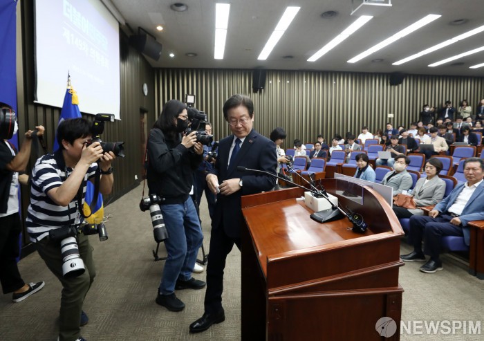 [서울=뉴스핌] 정일구 기자 = 이재명 더불어민주당 대표가 14일 오후 서울 여의도 국회에서 열린 당 의원총회에서 발언을 위해 이동하고 있다. 2023.05.14 mironj19@newspim.com