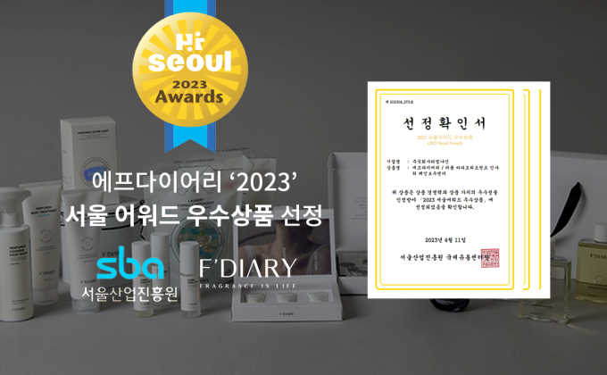 [서울=뉴스핌] 조한웅 기자 = 주식회사 티엠나인(대표 박정주)의 라이프 뷰티 브랜드 에프다이어리가 서울경제진흥원(SBA)에서 주최하는 '2023 서울 어워드' 우수상품에 지난해에 이어 2년 연속 선정되었다.