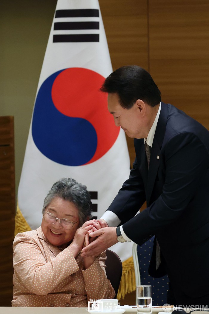 [서울=뉴스핌] 윤석열 대통령이 19일 히로시마 한 호텔에서 열린 히로시마 동포 원폭 피해자와의 간담회에서 박남주 한국원폭피해대책특별위 전 위원장의 손을 잡고 있다. [사진=대통령실] 2023.05.19 photo@newspim.com