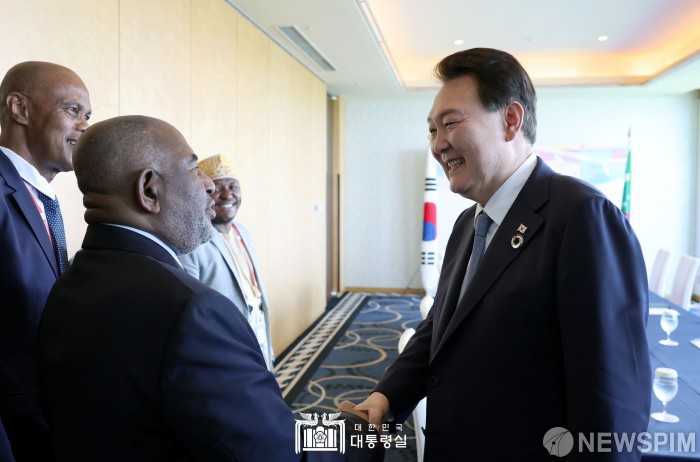 [서울=뉴스핌] 윤석열 대통령이 21일 히로시마 G7 정상회의장인 그랜드프린스호텔에서 열린 한-코모로 정상회담에서 아잘리 아수마니 코모로 대통령과 악수 하고 있다. [사진=대통령실] 2023.05.21 photo@newspim.com