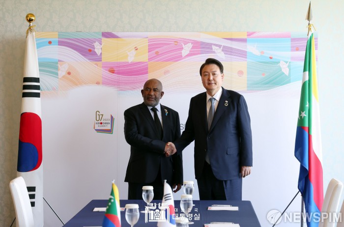 [서울=뉴스핌] 윤석열 대통령이 21일 히로시마 G7 정상회의장인 그랜드프린스호텔에서 열린 한-코모로 정상회담에서 아잘리 아수마니 코모로 대통령과 악수 하고 있다. [사진=대통령실] 2023.05.21 photo@newspim.com