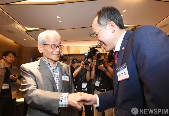 [서울=뉴스핌]추경호 부총리 겸 기획재정부 장관이 25일 서울 여의도 페이몬트호텔에서 열린 '경제개발 5개년 계획 수립 60주년 기념 국제컨퍼런스'에서 행사시작에 앞서 진념 부총리와 인사를 나누고 있다.[사진=기획재정부] 2023.05.25 photo@newspim.com
