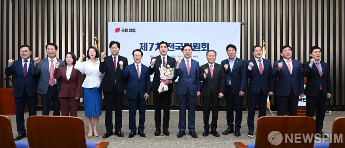 [서울=뉴스핌] 이형석 기자 = 김기현 국민의힘 대표와 윤재옥 원내대표를 비롯한 참석자들이 9일 국회에서 열린 최고위원 당선자 결과 발표에서 김가람 신임 최고위원 등과 함께 기념촬영을 하고 있다. 2023.06.09 leehs@newspim.com