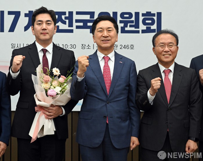 [서울=뉴스핌] 이형석 기자 = 김기현 국민의힘 대표와 윤재옥 원내대표가 9일 국회에서 열린 최고위원 당선자 결과 발표에서 김가람 신임 최고위원과 기념촬영을 하고 있다. 2023.06.09 leehs@newspim.com