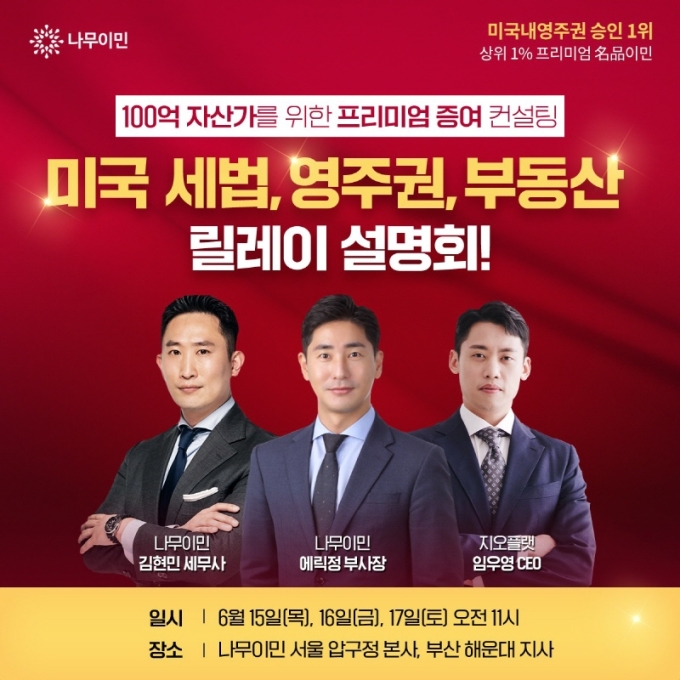 미국 내 영주권 승인 1위 나무이민에서는 6월 셋째 주 15일(목), 16일(금), 17일(토) 3일간 미국 부동산 투자, 한미 세법, 미국 영주권 릴레이 설명회를 서울과 부산에서 진행한다고 밝혔다.
