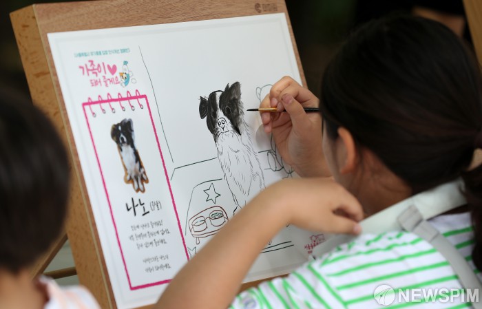 [서울=뉴스핌] 정일구 기자 = 11일 오후 서울 서초구 매헌시민의 숲에서 열린 반려견놀이터 개장 축제를 찾은 어린이가 유기동물 수채화 그리기를 하고 있다. 2023.06.11 mironj19@newspim.com
