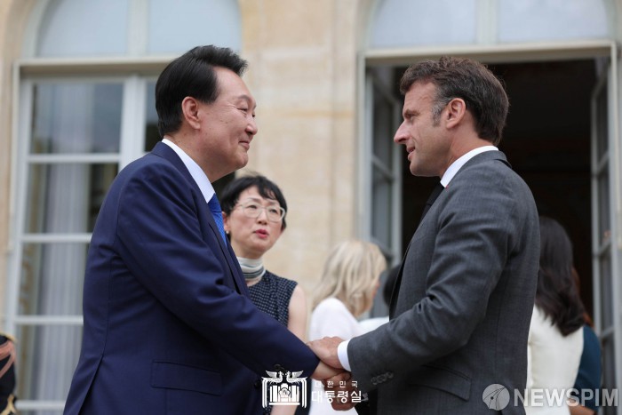 [서울=뉴스핌]윤석열 대통령과 에마뉘엘 마크롱 프랑스 대통령이 20일(현지시간) 파리 엘리제궁에서 단독회담을 마친 뒤 악수하고 있다.[사진=대통령실 ] 2023.06.20 photo@newspim.com