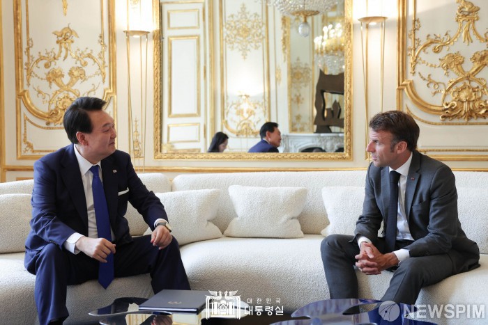 [서울=뉴스핌]윤석열 대통령이 20일(현지시간) 파리 엘리제궁에서 에마뉘엘 마크롱 프랑스 대통령과 단독회담을 하고 있다.[사진=대통령실 ] 2023.06.20 photo@newspim.com