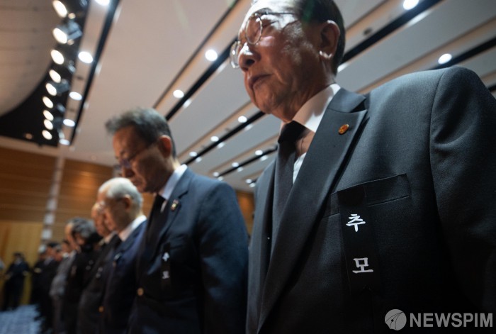 [서울=뉴스핌] 윤창빈 기자 = 26일 오전 서울 용산구 백범김구기념관에서 열린 백범 김구 선생 제74주기 추모식에서 참석자들이 묵념을 하고 있다. 2023.06.26 pangbin@newspim.com