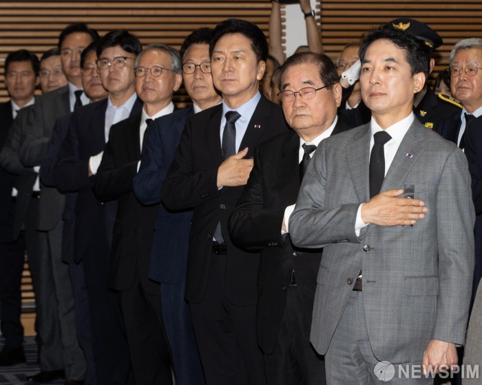 [서울=뉴스핌] 윤창빈 기자 = 박민식 국가보훈부 장관(오른쪽부터), 이종찬 광복회장, 김기현 국민의힘 대표, 박광온 더불어민주당 원내대표와 참석자들이 26일 오전 서울 용산구 백범김구기념관에서 열린 백범 김구 선생 제74주기 추모식에서 국민의례를 하고 있다. 2023.06.26 pangbin@newspim.com