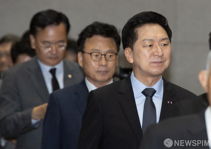 [서울=뉴스핌] 윤창빈 기자 = 김기현 국민의힘 대표(오른쪽), 박광온 더불어민주당 원내대표가 26일 오전 서울 용산구 백범김구기념관에서 열린 백범 김구 선생 제74주기 추모식에 참석하고 있다. 2023.06.26 pangbin@newspim.com