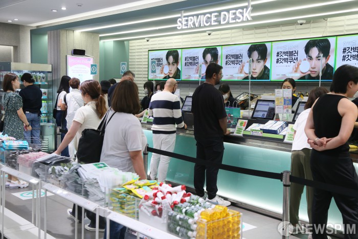 [서울=뉴스핌] 양윤모 기자 = 코로나 앤데믹이후 최근 1년새 방한 관광객 5배 늘었다는 통계가 발표된 4일 서울 명동을 찾은 동남아 관광객등 외국관광객들이 명동'올리브영'매장에서 쇼핑바구니를 들고 화장품과 다얄한 제품의 쇼핑을 즐기고 있다. 2023.07.04yym58@newspim.com