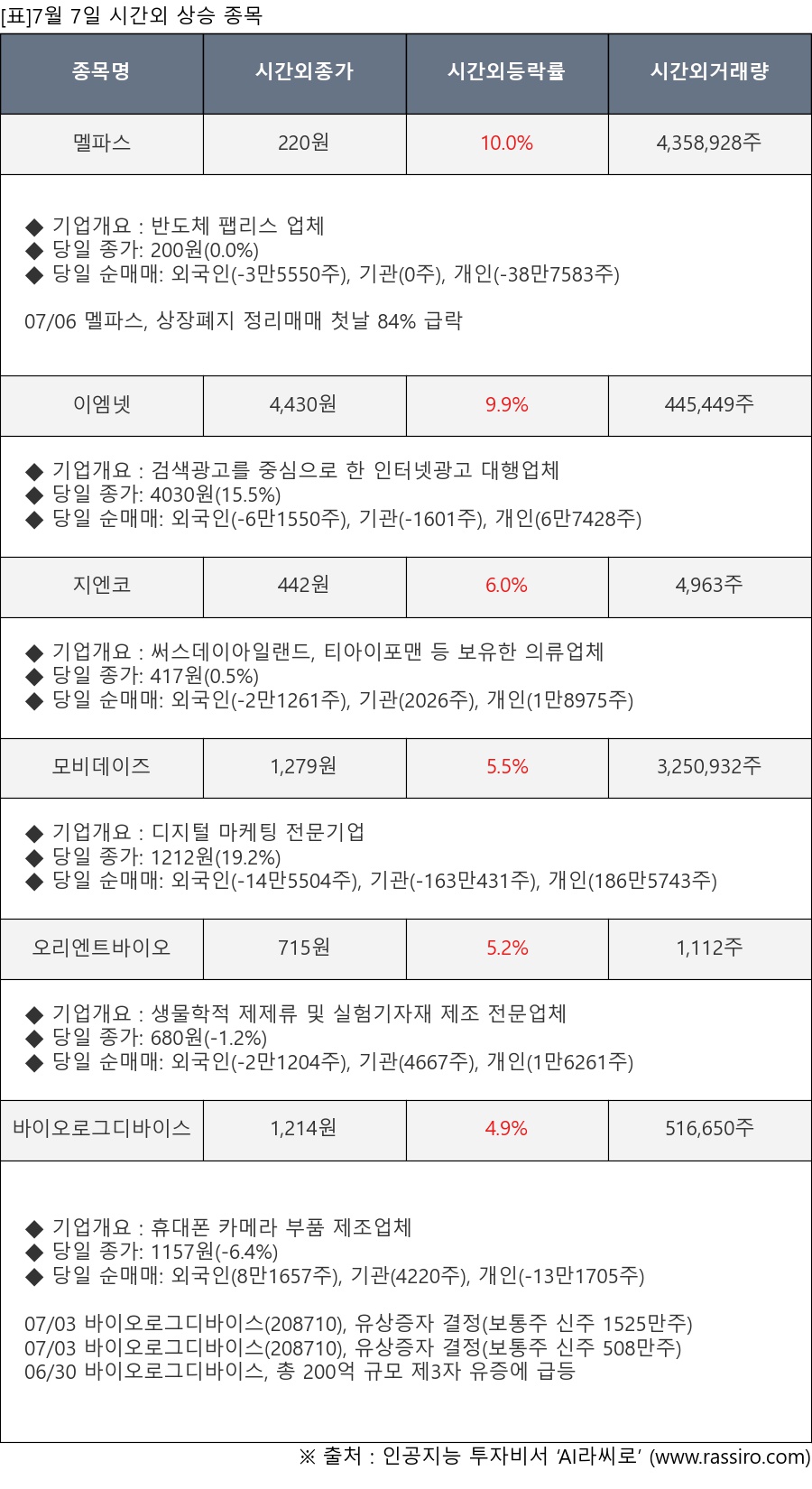 [서울=뉴스핌] 로보뉴스 = 7월 7일, 인공지능 투자비서 ‘AI라씨로’가 멜파스(096640), 이엠넷(123570) 등 시간외 단일가 매매 상승률 상위 종목들에 대한 최근 동향을 분석했다.