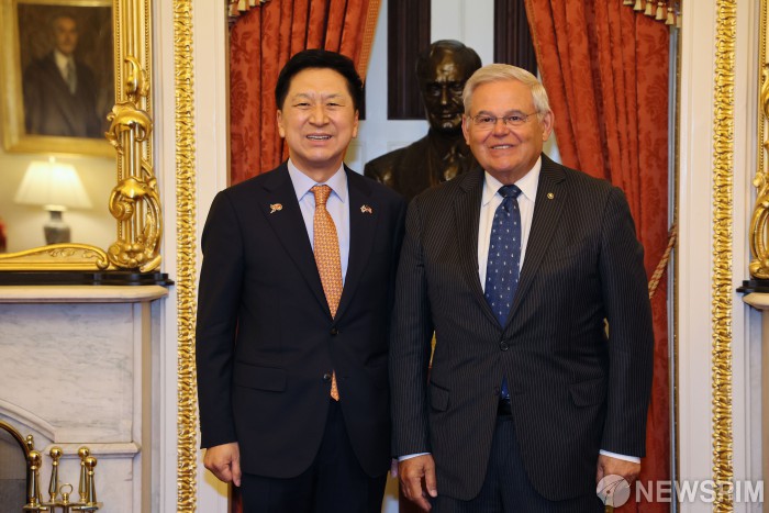 [서울=뉴스핌] 김기현 국민의힘 대표가 11일(현지시간) 오후 미국 국회의사당에서 밥 메넨데즈 상원 외교위원장과 기념촬영을 하고 있다. [사진=국민의힘] 2023.07.12 photo@newspim.com