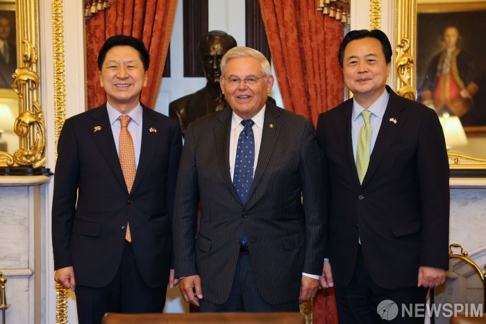 [서울=뉴스핌] 김기현 국민의힘 대표(왼쪽)가 11일(현지시간) 오후 미국 국회의사당에서 밥 메넨데즈 상원 외교위원장(가운데)과 기념촬영을 하고 있다. [사진=국민의힘] 2023.07.12 photo@newspim.com