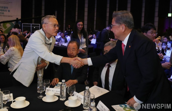 [서울=뉴스핌] 최지환 인턴기자 =유인촌 대통령비서실 문화특보와 박진 외교부장관이 25일 오전 서울 중구 웨스틴조선호텔에서 열린 '무형유산보호협약 20주년 국제회의 및 서울비전 선포식'에서 악수하고 있다. 2023.07.25 choipix16@newspim.com