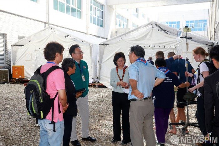 [서울=뉴스핌]조규홍 보건복지부 장관이 4일 전라북도 새만금 잼버리 영지에 설치된 잼버리 병원을 방문하여 의료대응 상황을 점검하고, 의료진들의 애로사항을 청취하고 있다.[사진=보건복지부] 2023.08.04 photo@newspim.com