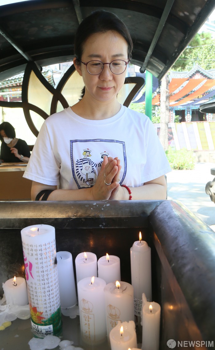 [서울=뉴스핌] 양윤모 기자 = 2024학년도 대학수학능력시험(수능)이 100일 앞으로 다가온 8일 전국 대부분 지역의 체감온도가 35도 이상으로 올라 찜통더위가 이어지는 가운데, 서울 종로구 조계사를 찾은 부모가 수능 고득점과 건강을 기원하고 있다. 2024학년도 수능은 오는 11월 16일 실시되며 49만여 명이 응시하는 가운데 졸업생(검정고시생 포함)은 34.1%인 16만7000명,고3 재학생은 32만4000명(65.9%)으로 나타났다. 2023.08.08 yym58@newspim.com
