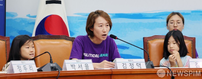 [서울=뉴스핌] 이형석 기자 = 김정덕 활동가가 8일 오전 서울 여의도 국회에서 열린 후쿠시마 오염수 해양투기 저지를 위한 아동·청소년·양육자 간담회에서 발언을 하고 있다. 2023.08.08 leehs@newspim.com