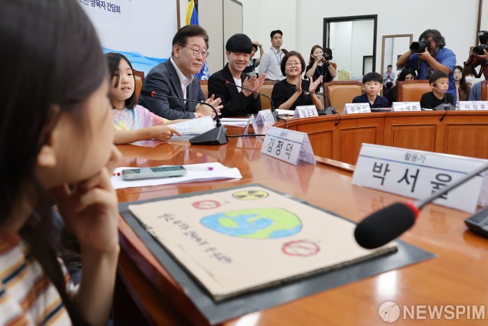 [서울=뉴스핌] 이형석 기자 = 이재명 더불어민주당 대표와 참석자들이 8일 오전 서울 여의도 국회에서 열린 후쿠시마 오염수 해양투기 저지를 위한 아동·청소년·양육자 간담회에서 김한나 어린이 활동가가 발언을 마치자 박수를 치고 있다. 2023.08.08 leehs@newspim.com