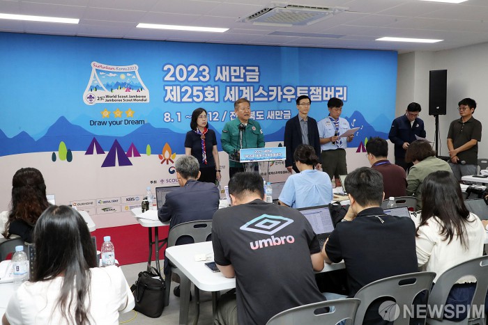 [서울=뉴스핌]이상민 행정안전부 장관이 8일 오전 전북 부안군 새만금 세계스카우트잼버리 프레스센터에서 태풍 북상에 대비한 참가 대원들의 비상대피 계획을 발표하고 있다.[사진=행정안전부 ] 2023.08.08 photo@newspim.com