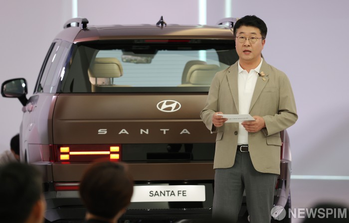 [파주=뉴스핌] 정일구 기자 = 홍정우 현대자동차 팀장이 지난 8일 경기 파주시 미메시스 아트 뮤지엄에서 열린 현대자동차 '디 올 뉴 싼타페' 미디어 프리뷰에서 발표를 하고 있다. 신형 산타페는 2018년 4세대 출시 이후 5년 만에 새롭게 탄생한 5세대 모델로 도심과 아웃도어 라이프를 모두 아우르는 현대차 대표 중형 SUV다. 2023.08.08 mironj19@newspim.com