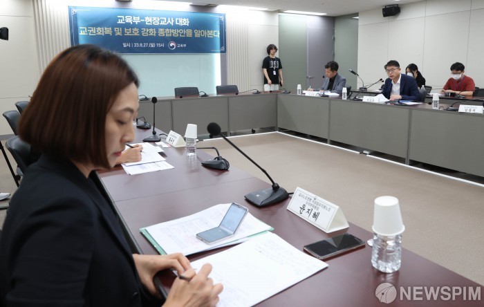 [서울=뉴스핌] 이호형 기자 = 교육부가 27일 오후 종로구 정부서울청사에서 교권 회복 대책에 대한 현장교사와 공개 토론회를 개최했다. 교육부 장상윤 차관이 공개 토론회에서 모두 발언을 하고 있다. 2023.8.27 leemario@newspim.com