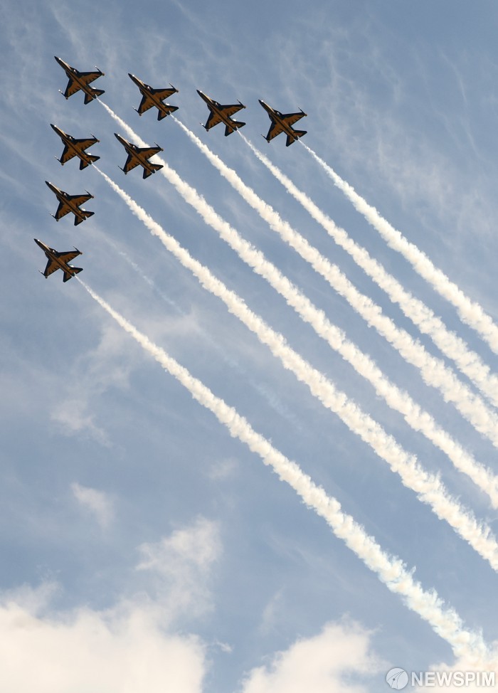 [서울=뉴스핌] 김학선 기자 = 공군 특수비행팀 블랙이글스가 31일 서울 종로구 광화문광장 상공에서 제75주년 국군의 날 축하비행 예행연습을 하고 있다. 국방부는 다음 달 26일 예정된 건군 75주년 국군의 날 행사를 앞두고 9월 6일과 20일 서울 한강 일대, 9월 24~25일 광화문·서울시청 일대에서 '군 문화 체험행사'를 개최한다. 2023.08.31 yooksa@newspim.com