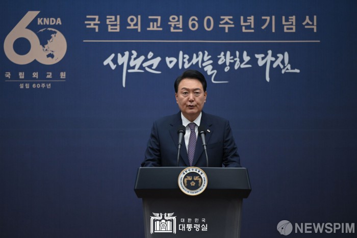 [서울=뉴스핌]윤석열 대통령이 1일 서울 서초구 국립외교원에서 열린 국립외교원 60주년 기념식에서 축사하고 있다.[사진=대통령실] 2023.09.01 photo@newspim.com