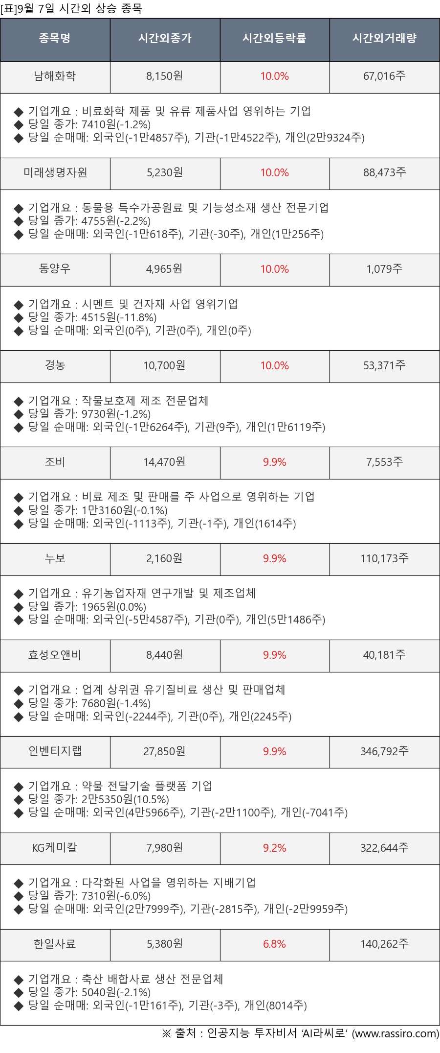 ※ 관련 종목: 남해화학, 미래생명자원, 동양우, 경농, 조비, 누보, 효성오앤비, 인벤티지랩, KG케미칼, 한일사료