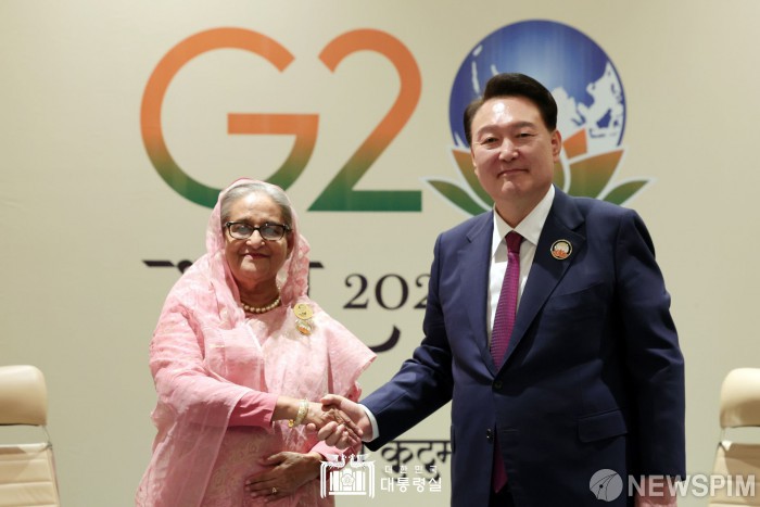 [서울=뉴스핌] 윤석열 대통령이 9일(현지시간) 뉴델리 바라트 만다팜 국제컨벤션센터에서 열린 한-방글라데시 정상회담에서 셰이크 하시나 방글라데시 총리와 악수하고 있다.[사진=대통령실] 2023.09.09 photo@newspim.com