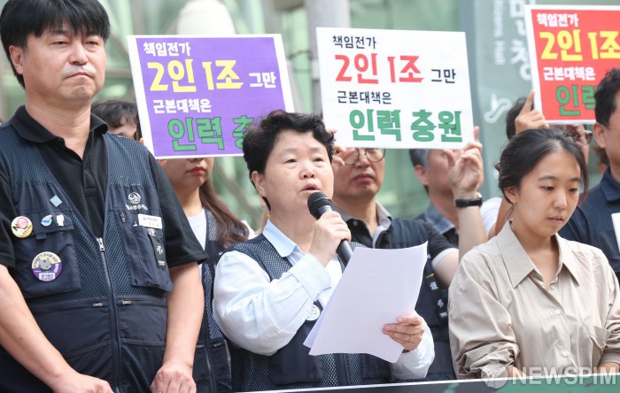 [서울=뉴스핌] 이호형 기자 = 민주노총 공공운수노조원들이 11일 오전 서울시청 앞에서 신당역 살인 사건 1주기 관련 기자회견을 열고 정부·서울시·서울교통공사에 안전대책과 제도를 마련할 것과 사업주의 책임 강화 및 미이행 시 처벌을 요구했다. 공공운수노조 현정희 위원장이 발언하고 있다. .2023.09.08 leemario@newspim.com