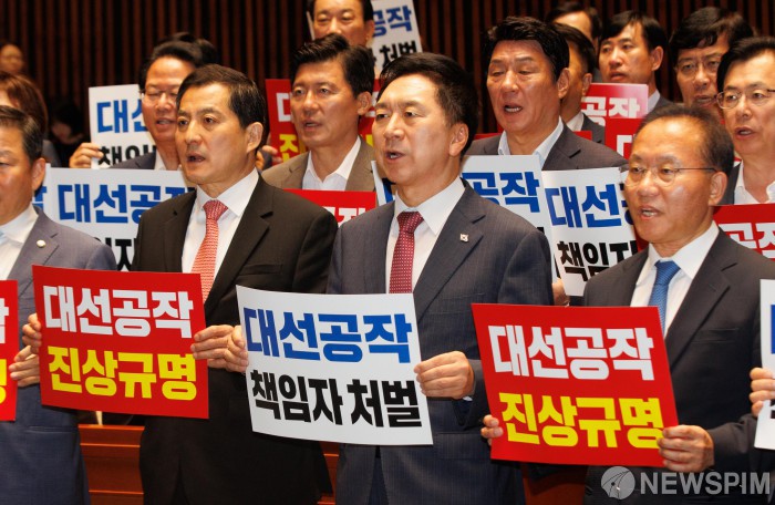 [서울=뉴스핌] 윤창빈 기자 = 김기현 국민의힘 대표, 윤재옥 원내대표와 소속 의원들이 11일 오후 서울 여의도 국회에서 열린 의원총회를 마치고 피켓을 들고 구호를 외치고 있다. 2023.09.11 pangbin@newspim.com