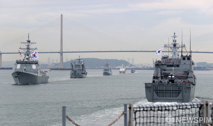 [인천=뉴스핌] 정일구 기자 = 15일 인천 팔미도 인근 해상에서 열린 제73주년 인천상륙작전 전승행사에서 해군 함정이 해상사열을 하고 있다. 2023.09.15 mironj19@newspim.com