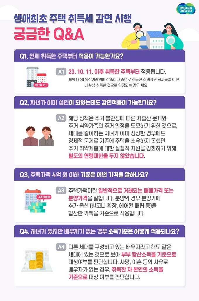 [수원=뉴스핌] 박승봉 기자 = 부부합산소득이 1억 원 이하이고 자녀가 1명 이상 있는 도민이 4억 원 이하 경기도 주택을 생애 최초로 구입할 경우 취득세 전액을 면제받는다.
