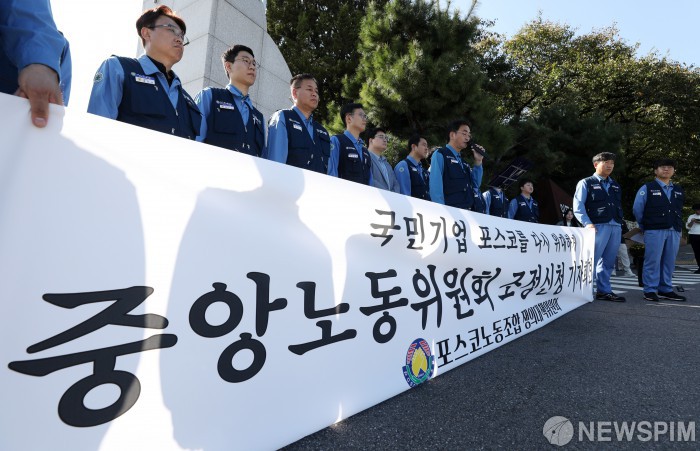 [서울=뉴스핌] 정일구 기자 = 포스코노동조합 쟁의대책위원회 관계자들이 10일 오후 서울 동작구 국립서울현충원 앞에서 중앙노동위원회 조정신청 기자회견을 하고 있다. 포스코노조의 중앙노동위 조정신청은 포스코 창립 55년 만에 처음이다. 2023.10.10 mironj19@newspim.com
