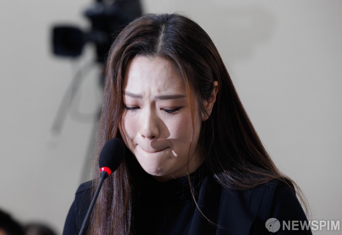 [서울=뉴스핌] 윤창빈 기자 = 김려흔 (주)뉴려 대표이사가 16일 오후 서울 여의도 국회에서 열린 정무위원회의 공정거래위원회에 대한 국정감사에 참고인으로 출석해 의원 질의에 답변하던 도중 울먹이고 있다. 2023.10.16 pangbin@newspim.com