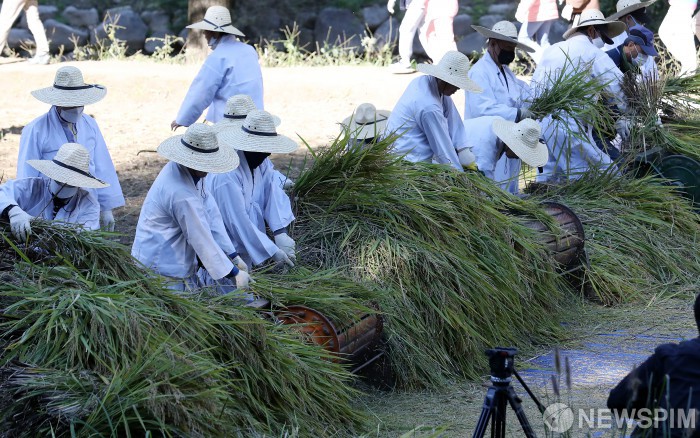 [서울=뉴스핌] 정일구 기자 = 20일 오전 서울 강남구 양재천 벼농사 학습장에서 열린 2023 양재천 전통 벼베기 체험 행사에서 관계자들이 벼탈곡 작업을 하고 있다. 2023.10.20 mironj19@newspim.com