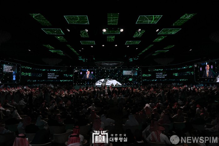 [서울=뉴스핌] 윤석열 대통령이 24일(현지시간) 사우디 리야드 킹 압둘아지즈 국제 컨퍼런스 센터에서 열린 미래 투자 이니셔티브 포럼에서 특별 대담을 하고 있다.[사진=대통령실] 2023.10.25 photo@newspim.com