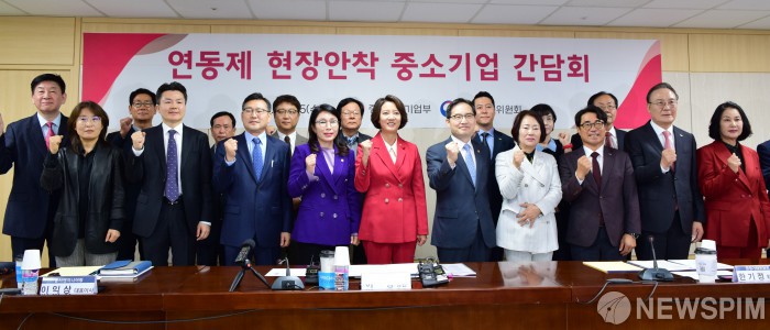 [서울=뉴스핌]이영 중소벤처기업부 장관(앞줄 가운데)이 25일 서울 중구 대·중소기업·농어업협력재단에서 연동제 현장안착 중소기업 간담회를 마치고 한기정 공정거래위원장(이영 장관 오른쪽)을 비롯한 중소기업 협·단체 등 참석자들과 기념 촬영을 하고 있다. [사진= 중소벤처기업부 ] 2023.10.25 photo@newspim.com