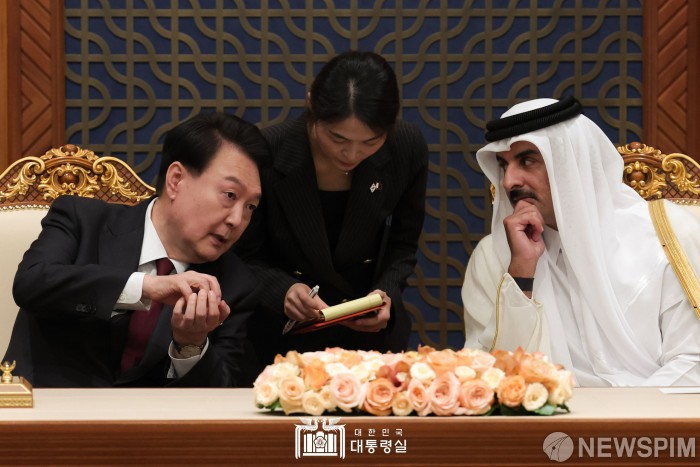 [서울=뉴스핌] 윤석열 대통령이 25일(현지시간) 카타르 도하 아미리 디완 왕궁에서 열린 한·카타르 MOU 서명식에서 타밈 빈 하마드 알사니 카타르 국왕과 대화하고 있다.[사진=대통령실] 2023.10.25 photo@newspim.com