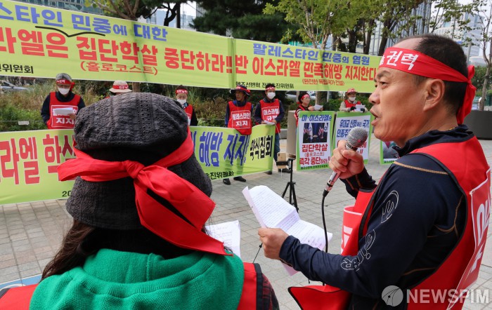 [서울=뉴스핌] 양윤모 기자 = 헬조선변혁전국추진위원회는 26일 오후 광화문 동아일보사앞에서 계속되는 이스라엘-팔레스타인 전쟁에서 이스라엘의 학살을 규탄하고 팔레스타인 해방을 지지하는 집회를 개최했다. 2023.10.26 yym58@newspim.com
