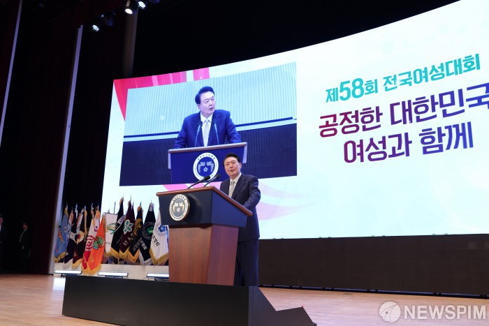 [서울=뉴스핌] 윤석열 대통령이 1일 서울 강남구 코엑스에서 열린 제58회 전국여성대회에서 축사를 하고 있다. [사진=대통령실] 2023.11.01 photo@newspim.com